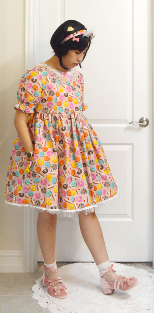 Another shot of myself wearing the donut print dress, with hands in the big deep pockets and looking at my cute pink velvet shoes. I’m just so happy I remembered to add pockets, this brings an almost too simple dress to a useful and relaxing dress.