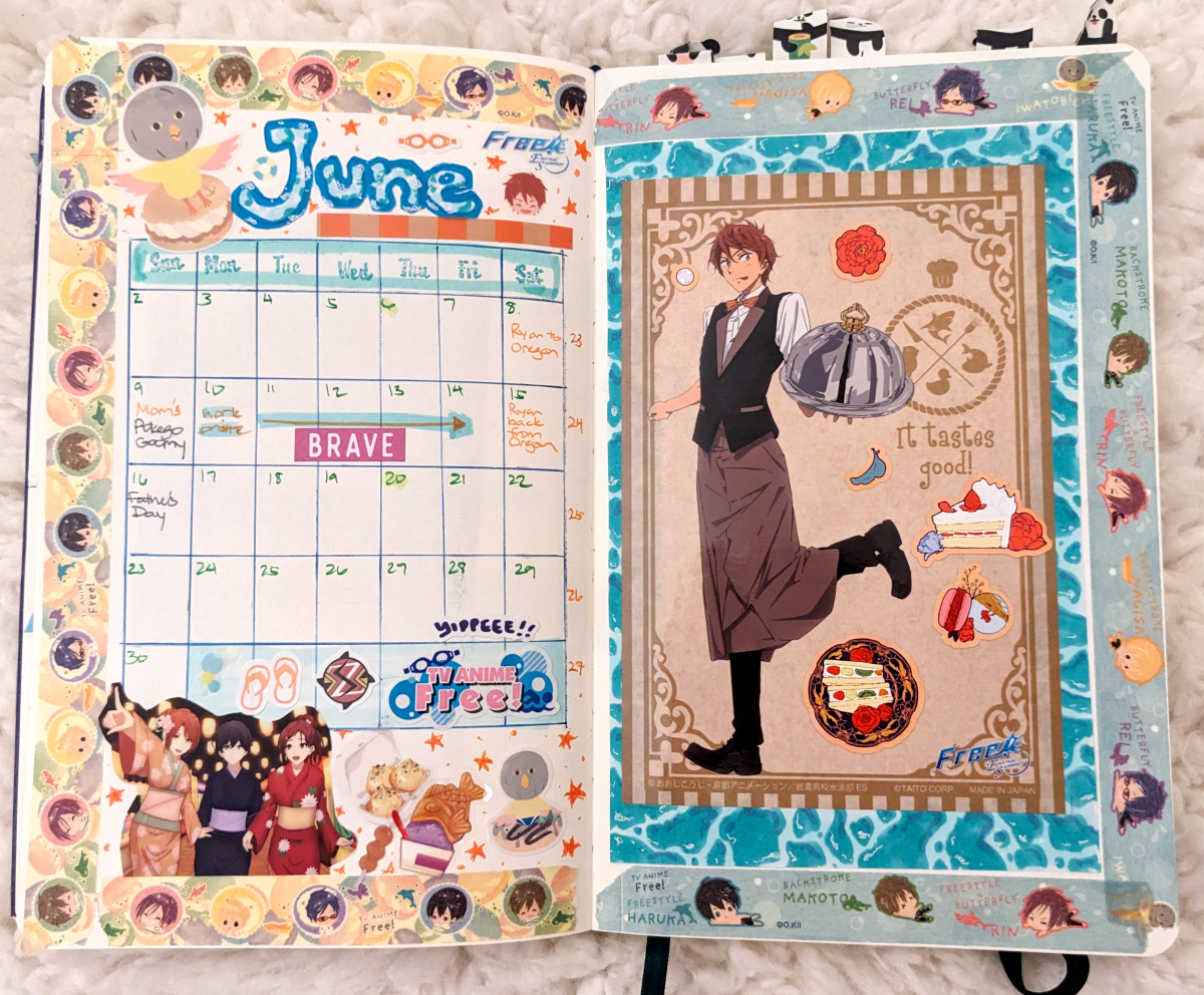 June 2024 monthly spread, starring no fanart from me lol, just a bunch of stickers from Free! Iwatobi Swim Club anime. The star is Mikoshiba Momotarou from Samezuka High School, nicknamed the sea otter, famous for his backstroke.