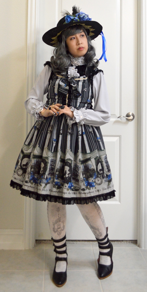 photo of me wearing blue/black colorway of Metamorphose’s Voyage in Memory jumperskirt with a decorated hat