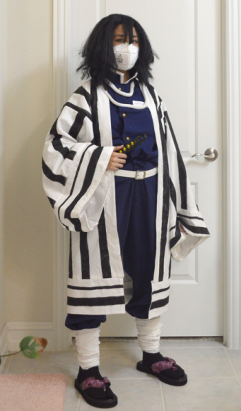 photo of myself in my bathroom wearing Obanai Iguro cosplay and a n95 mask