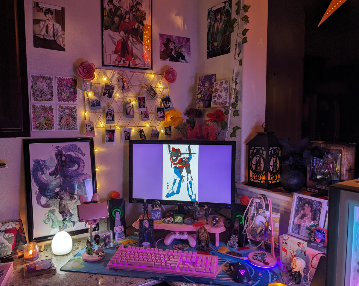 night time photo of spooky autumn themed PC setup with various art and merch of toxic and poisonous characters and themes – including my latest favorite, Starscream, but also got some good merch of Qi Rong, medicine seller, Maomao, Gengar, Alucard.