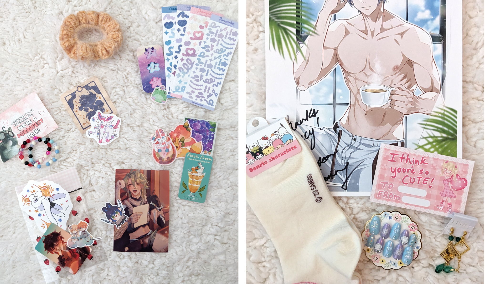 haul from another Valentine's Day art market! plus voice actor signed poster and socks/earrings that are not from small business
