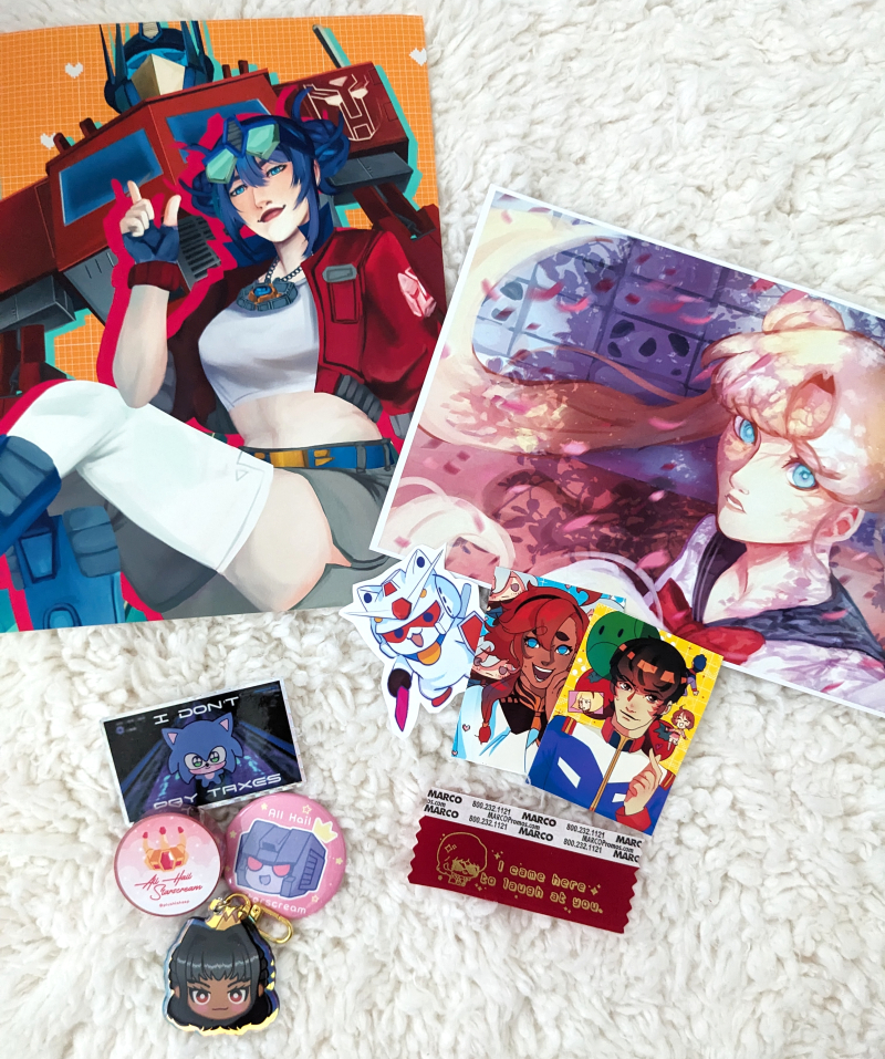 Merch haul from the Gundam pop up event at Toridori. I might have gotten a drink, but I know I did get a matcha cupcake which was yummy, and then bought from 2 artists to get the trading card and sticker bundle prize, heheh. The Sonic sticker, Starscream pin and washi tape and bishoujo Starscream charm are from plushisheep again and also starlitesparrow and pikel.art. The Optimus Prime and bishoujo print and Sailor Moon print is from cookie keko. Haven’t even watched Gundam yet, was just there to chat lol.
