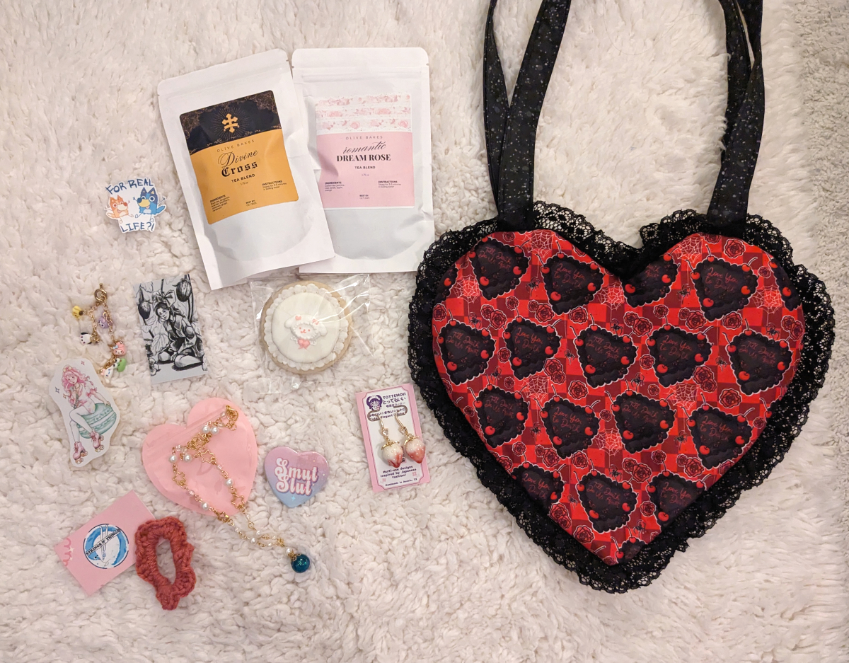 Here is everything I got from Kirakira market on April 5th! You can see my wa-lolita coord for that event on a previous post. First off are two loose leaf tea bags and a kumya frosted sugar cookie from Olive Bakes. I also got sparkly strawberry earrings and custom nails (pics in a future post) from Tottemoii Designs. I got the handmade black/red heart purse from SewSpoiledCrafts on Instagram. The crochet scrunchie was from Strings N Things and the lolita sticker and Sanrio bracelet from Pastel Polaris Shop. I have no idea where the Bluey sticker came from, it was a freebie. And the pearl necklace and smut slut badge was from Starpo Shop. All in all, a decent haul from a few makers I haven’t shopped at yet before!
