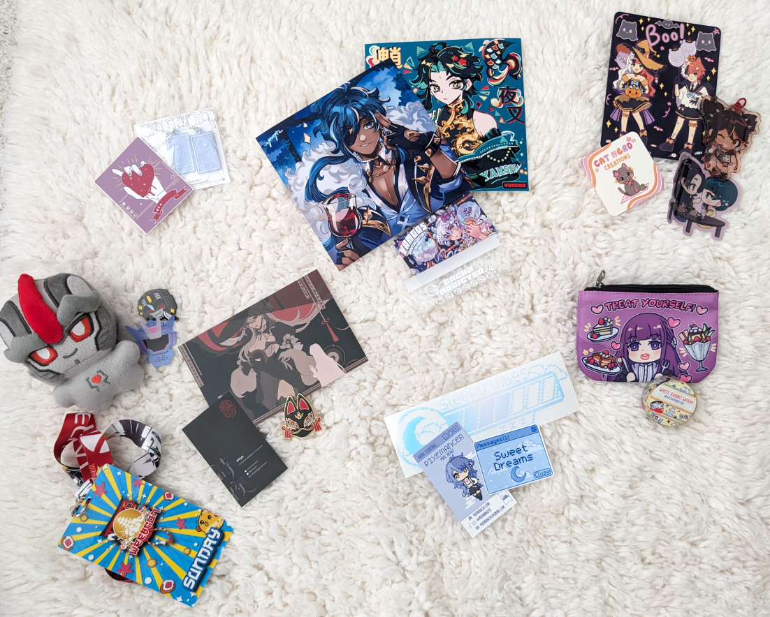 Now for my merch haul from Weeb-con artist alley! This is my first year attending, it was kind of close to my house, my friends were vending, and I wanted to see what it was all about, so I just went on Sunday for a few hours. On the lefthand side is Transformers Prime Starscream plushie with a Starscream knife enamel pin and Soundwave sticker, all from plushisheep. The tarot card earrings and heart sticker are from rinnekanzaki. The Genshin prints and gacha badge ribbon are from yangosart. The cute Xinyan charm and Apothecary Diaries sticker are from Cat Nerd Creations. The Fern bag and white rabbit washi tape are from Mochiron Store. The sweet dreams and sleepy vibes pixel stickers are from Pixemancer. And the fox pin and witch print are from Shiye (carrd link.)