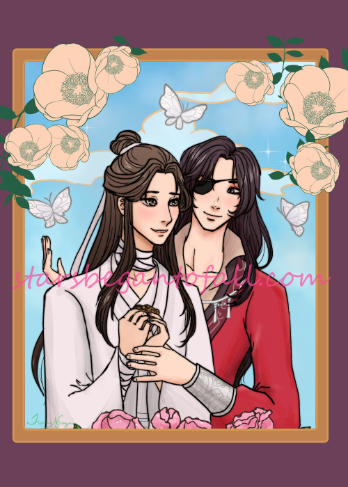 portrait of Xie Lan and Hua Cheng from Heaven Official's Blessing donghua surrounded by flowers