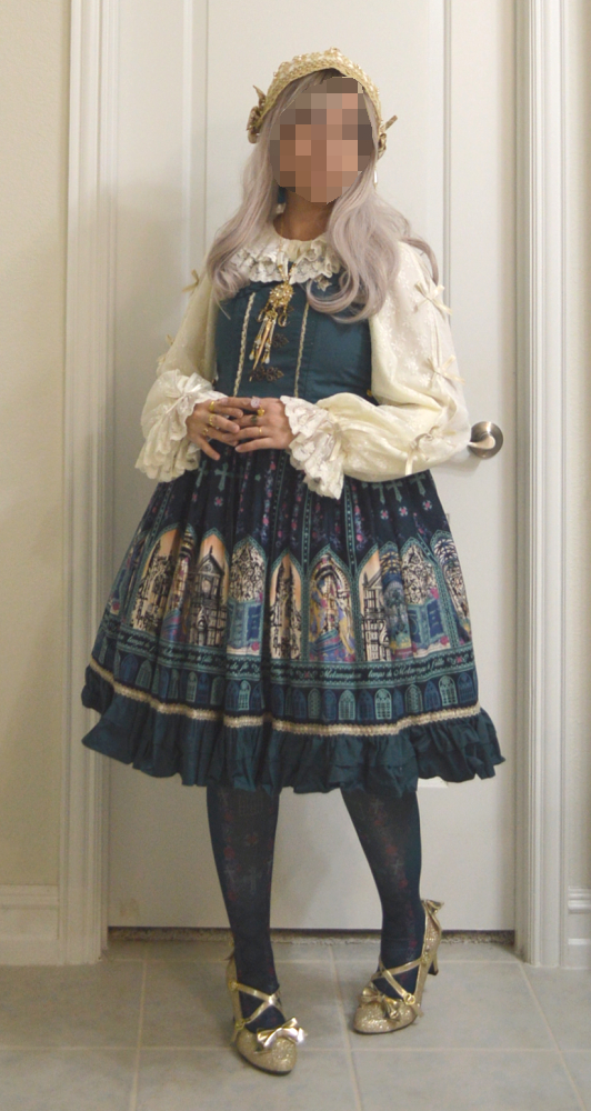 photo of Metamorphose Temps de Filles coord of Rose Palace jumperskirt in teal colorway with cream and gold accents