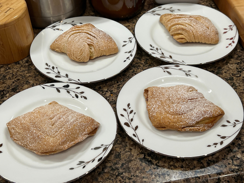 photo of four very homemade sfogliatelle Italian pastries covered with powdered sugar